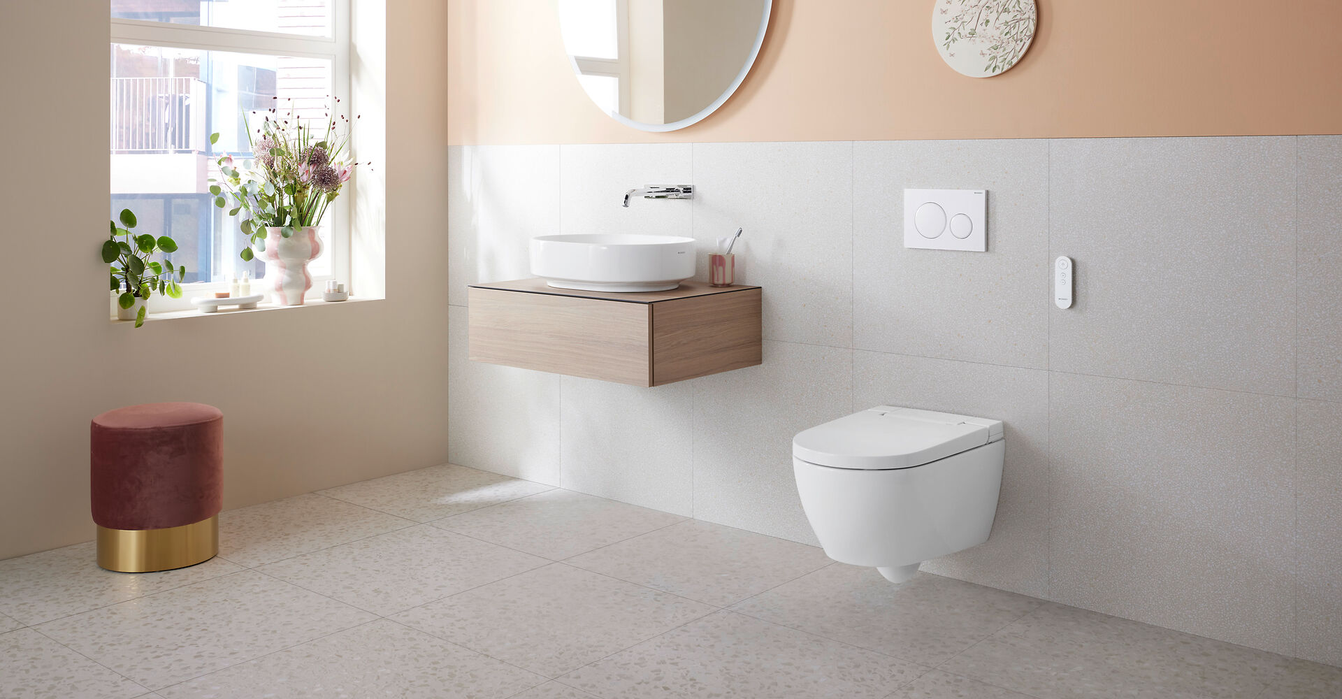• Asymmetrischer Mineralguss-Waschtisch mit Waschtischunterschrank